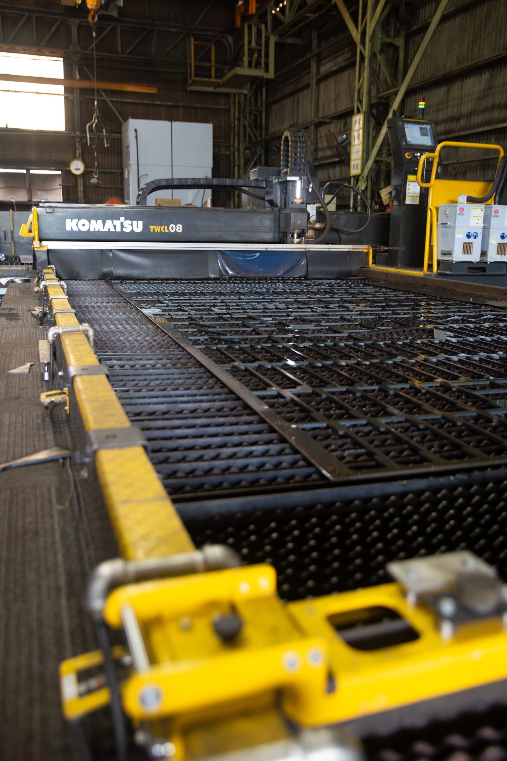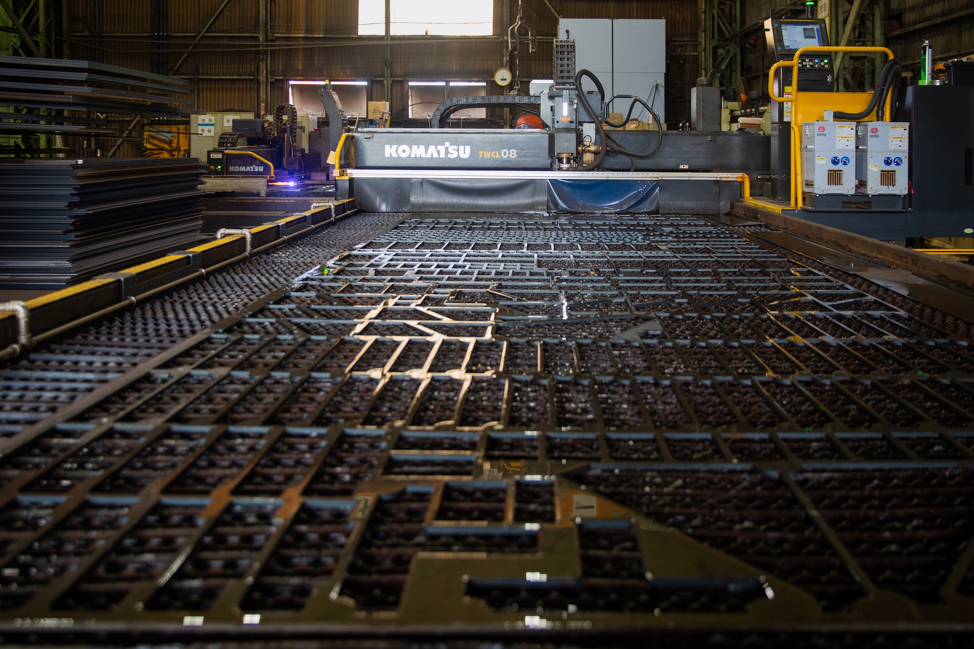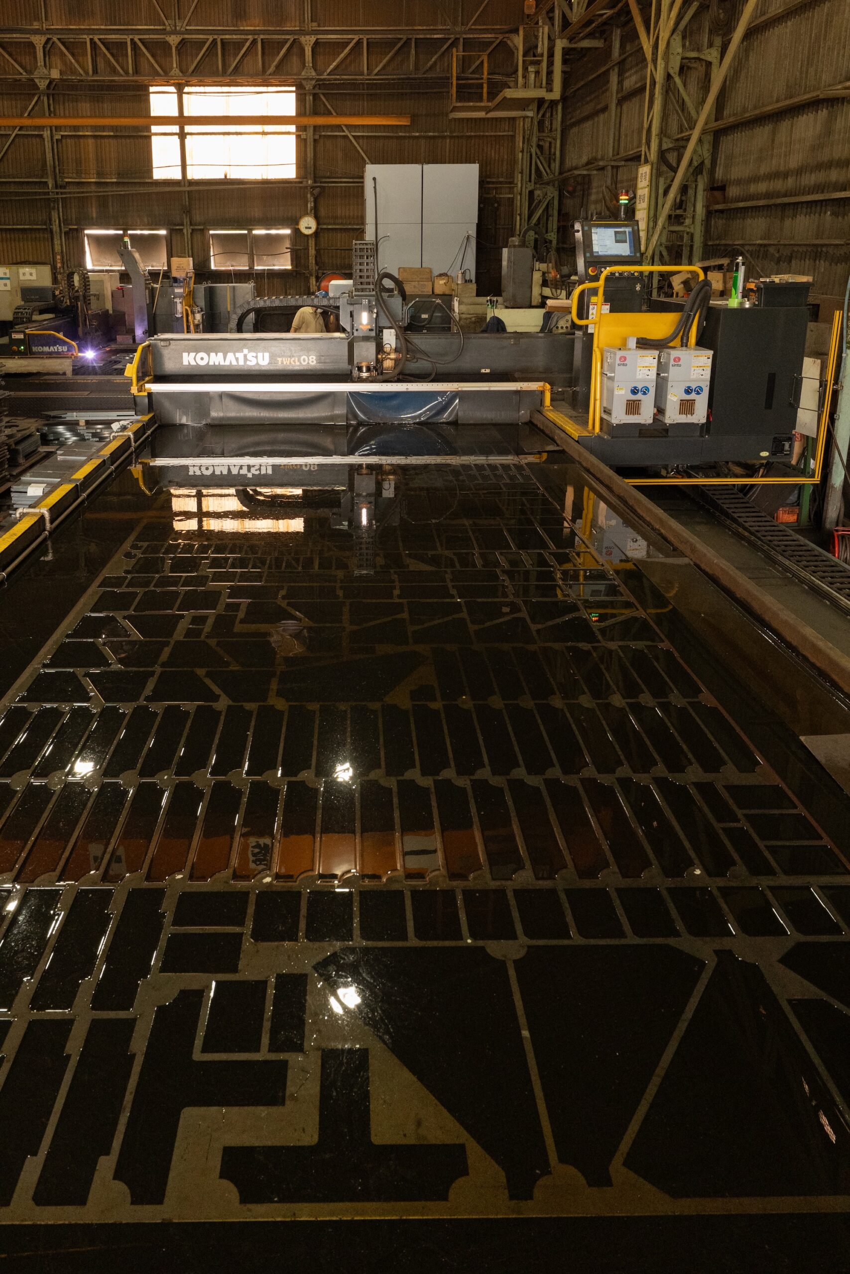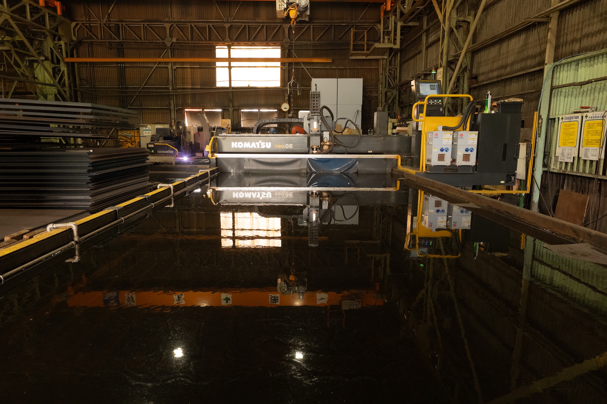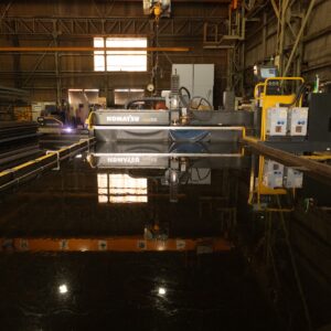 水中で厚板母材を切断する「水中ファイバーレーザ加工機」を、2023年2月に全国で初めて導入しました。世界にわずか3台しか存在せず、今後製造予定のない大変希少な設備です。主に建築向けの細型厚板切板製品の品質向上・安定化を図ることが可能で、品質面だけでなく、投資を通じた作業性改善や働きやすい職場環境の構築、エネルギーコスト低減も実現します。
